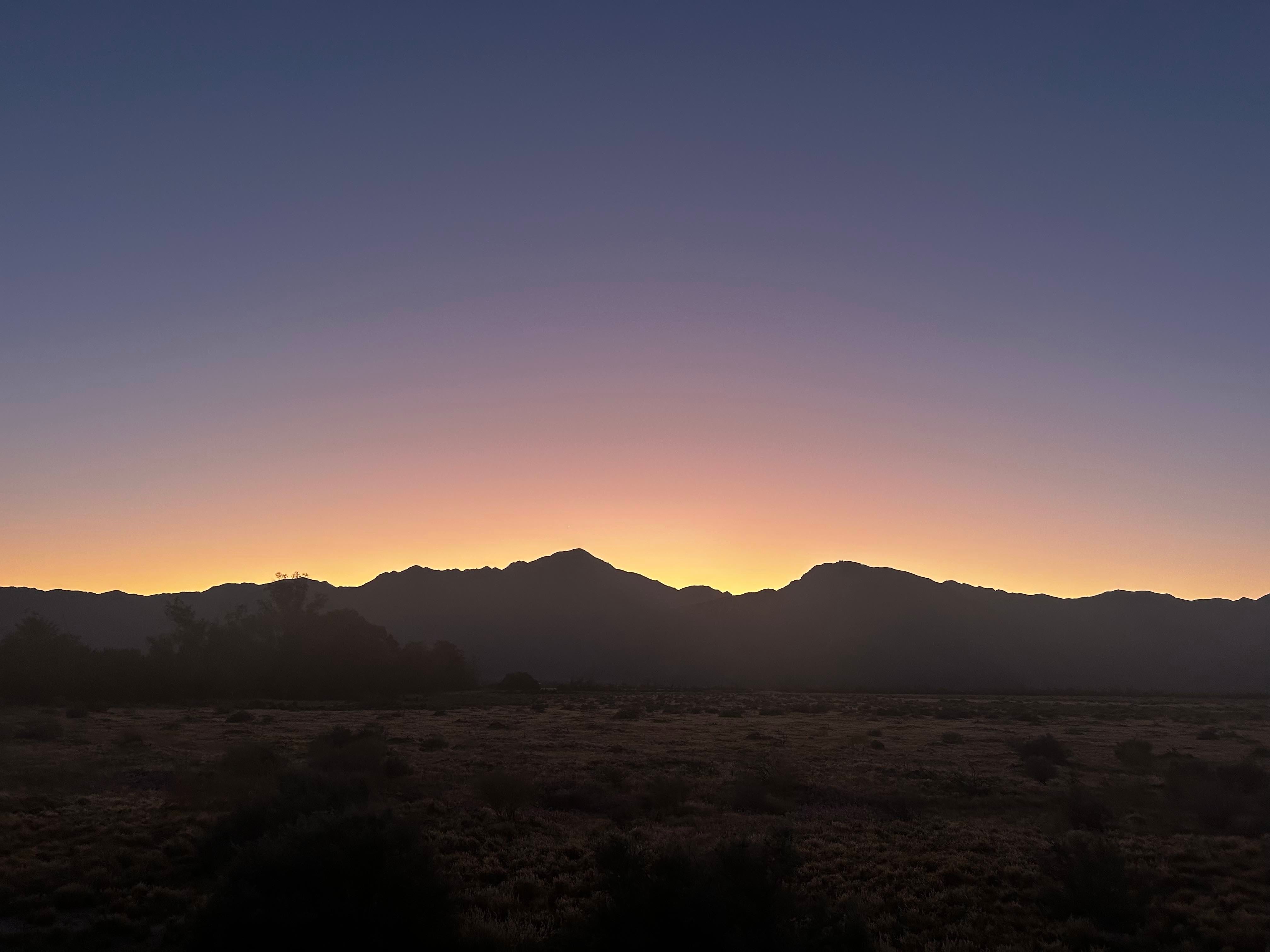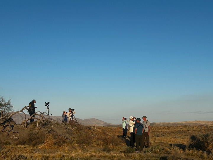 I woke up Tuesday to the sound of coyotes and chickens and barking dogs. The sounds of the desert, in this case, the Sonoran Desert. I saw a coyote as I was circling the fields north of Palm Canyon Road, which cuts across the Borrego Valley floor, looking for the evening Hawkwatch. Nearly 600 feet above sea level, the surrounding mountains— Santa Rosa, San Ysidro, and Vallecito — are all between 3000 and 8000 feet. An hour before sunset, the crew started to arrive ready to witness the incoming birds from a small dune a few feet off the side of the road. The evening watch assesses what the morning watch — who does the official count — can expect. Two days before, 100 Swainson’s Hawks had come through. On Sunday they had 15 birds.