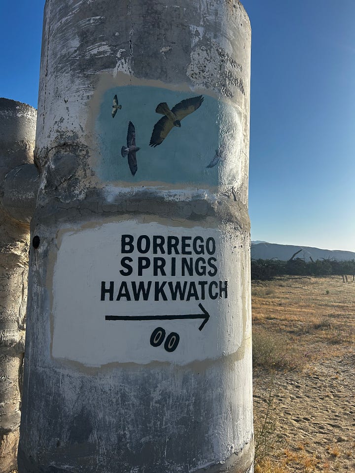 Seeing the Hawkwatch film, talking with other hawkwatchers, put a bee in my bonnet about going to Borrego Springs site as part of an already-planned trip Pasadena. Let’s see….an arty desert towns surrounded by beauty. A general sense of discovery and possibility. Raptor migration…road trip….It would (and did) entail a lot of driving but I couldn’t resist, even if I first had a couple of rehearsals, a gig, and the installation for bird-art exhibit I curated for Rhythmix in between.