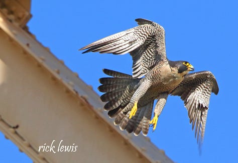 In the meantime, spring — crazy warm though it is here now in California — means the actual birds, including the real stars of my show, Peregrine Falcons, are either on the migratory move or beginning to nest. We’ve gone out to look at the local falcons several times this week who seem to be on track. Phew! It’s been a tough year for falcon population due to avian influenza and our fingers are crossed that the local pair has a successful year.