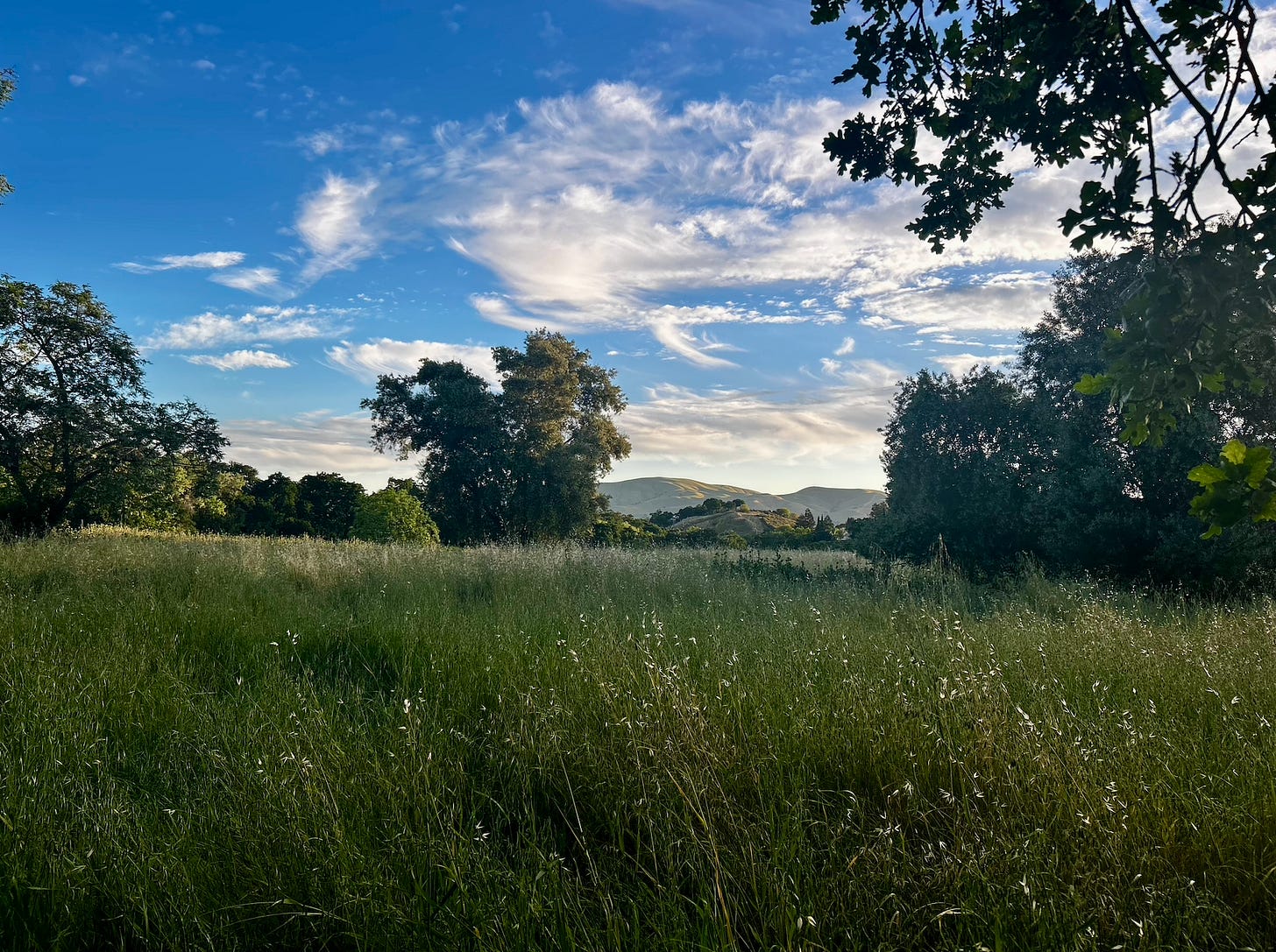 The Galindo Creek Field Station — inland, in a riparian area next to a field up the road from some sports fields on the Cal-State East Bay Concord — was lush with tall grass, creekside bushes and trees. As we volunteers arrived, the air was full of birdsong: Red-shouldered Hawks yelling; Lesser Goldfinch whistling and sighing, and a bunch Yellow-rumped Warbler chek-chek-chek-ing from the trees — the core team and were ready to start erecting nets and collecting data. Hallie, the master bander and permit-holder was the ringleader who did the bulk of the banding with two skilled volunteers.