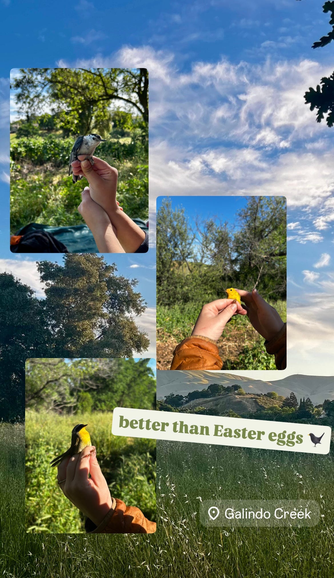 It was a busy day. More than 40 birds came into the nets, including a Nuttal’s Woodpecker; two Yellow-breasted Chats; a female Ruby-crowned Kinglet with a tic-tac sized egg (an Easter egg of another kind!) in her oviduct; a rightfully-combative Black Phoebe, and a Hammond’s Flycatcher which needed some botany-level checks to accurately identify, even in hand. Two male Anna’s Hummingbird mid-chase, flew into the nets as well, though they weren’t banded, hummingbirds needing a whole other level of handling care as well as hand-rolled bands.