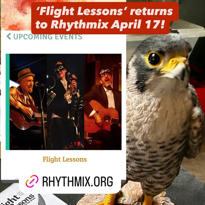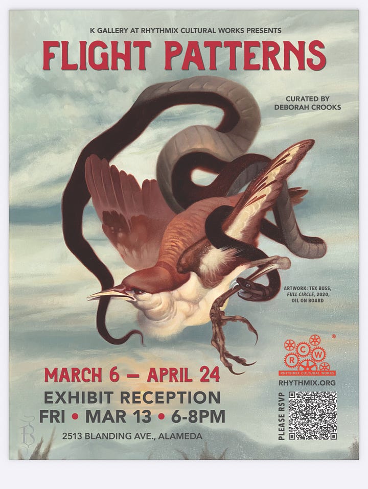 I’ve been riding a bit of a beauty high. Two weeks after the nourishing time in Morro Bay I retreated to Santa Cruz with a half-dozen others artists for some dedicated songwriting time. The weather was glorious (and a bit disorienting given the actual season!). Great sunsets, sunrises, morning walks on the beach and sharing songs after dinner is the medicine, I tell you! Before that, I spent the bulk of a weekend at The Winged Migration Expo on Mare Island in Vallejo, which was a great, educational and encouraging event for the many people and organizations working on all aspects of bird and bird-related conservation. I got to table about Flight Lessons — and Flight Patterns, an art exhibit I’ve had the privilege to curate in conjunction with the next FL performance at Rhythmix — alongside the good people at Buteo Books, and also did did a short presentation and played songs from the show with Kwame on the presenter’s stage.